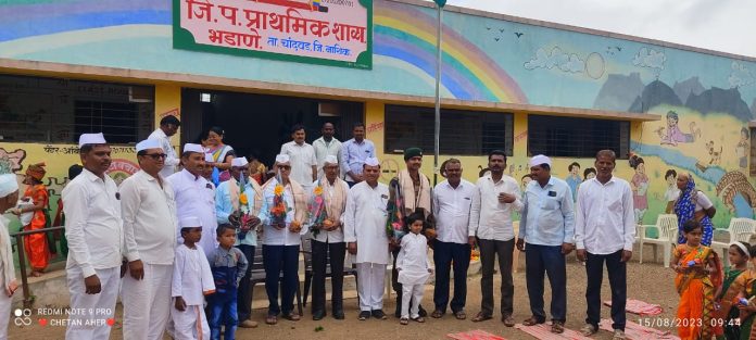 चांदवड : दि.१५/०८/२०२३ मंगळवार रोजी जि.प.प्राथमिक शाळा भडाणे ता-चांदवड येथे भारतीय स्वातंत्र्याचा ७६ वा स्वातंत्र्यदिन मोठ्या उत्साहात साजरा करण्यात आला.सर्वप्रथम गावातुन प्रभातफेरी काढण्यात आली.विद्यार्थ्यांच्या घोषणांनी संपूर्ण परिसर दुमदुमुन गेला.यानंतर ग्रामपंचायत कार्यालय येथे ध्वजारोहन मा.सरपंच यांचे वडिल श्री .शामराव काळू आहेर (जेष्ठ नागरीक) यांच्या हस्ते करण्यात आले.यानंतर जि.प.शाळा भडाणे येथे आर्मी मध्ये सेवा करणारे श्री . शरद आण्णा बनकर (चीन सीमेवर कार्यरत) यांच्या हस्ते ध्वजारोहन करण्यात आले.शिलाफलकांचे अनावरण स्वातंत्र्य सैनिक श्री.जगन्नाथ यशवंत शिंदे , संपत हरिभाऊ कळमकर ,भास्कर गटलू सोनवणे यांचे हस्ते करण्यात येऊन पंचप्राण शपथ घेण्यात आली .कलशाचे पुजन करण्यात आले.*स्वातंत्र्य सैनिकांचा सत्कार करण्यात आला.विद्यार्थी व पालकांची निपून भारत अभियानाची शपथ घेण्यात आली.विद्यार्थ्यांना स्काऊट गाईड चे ड्रेस वाटप करण्यात आले.ग्रामपंचायत आवारात वृक्षारोपण करण्यात आले.यानंतर विद्यार्थ्यांनी भाषणे केली.दिपक वाघ यांनी आपले मनोगत व्यक्त केले.ग्रामपंचायत भडाणे तर्फे मुलांना भिस्कीट पूडे वाटप करण्यात आले. कार्यक्रम यशस्वीतेसाठी ग्रामपंचायत कर्मचारी राहूल वाघ ,संगमजी,मारुती सोनवणे, शालेय पोषण आहार शिजवणारे स्वयंपाकी सरला वाघ व मदतनीस रघूनाथ वाघ यांचे सहकार्य लाभले. या प्रसंगी सरपंच श्री.सुनिल आहेर, उपसरपंच श्री.भाऊसाहेब सोनवणे , ग्रामसेवक श्री .रावसाहेब खोकले भाऊसाहेब , पंचायत समिती सदस्य श्री . देविदास आहेर , पोलीस पाटिल श्री .सागर आहेर, तंटामुक्ती अध्यक्ष श्री .अनिलजी आहेर, शाळाव्यवस्थापन समिती अध्यक्ष श्री.समाधान आप्पा आहेर, उपाध्यक्ष श्री .जगदिशभाऊ वाघ, अंगणवाडी ताई निकम मँडम ,शाळेतील शिक्षिका दुसाने मँडम , सोसायटी चेअरमन व सदस्य तसेच गावातील बहुसंख्य नागरीक उपस्थित होते. कार्यक्रमाचे सुञसंचलन श्री.सूर्यकांत जाधव सर यांनी केले.