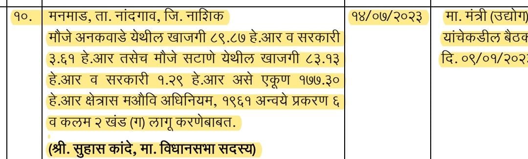 3.61 हे.आर तसेच मौजे सटाणे येथील खाजगी 83.13 हे.आर व सरकारी 1.29 हे.आर असे एकू ण 177.30 हे.आर क्षेत्रास मऔधव अधधधनयम, 1961 अन्वये प्रकरण 6 व कलम 2 खांड (ग) लागू करणेबाबत.हिंदुहृदयसम्राट बाळासाहेब ठाकरे करंजवण मनमाड पाणी पुरवठा योजनेचे भूमिपूजन प्रसंगी मनमाड येथे मुख्यमंत्री एकनाथजी शिंदे साहेब यांनी एम आय डी सी मंजूर करत असल्याचे जाहीर केले होते.अनेक वर्षांपासून मनमाड व मतदारसंघातील नागरिक एम आय डी सी च्या प्रतीक्षेत होते, आज सर्वांचे स्वप्न पूर्ण होत आहे, या मुळे मोठ्या संख्येने रोजगार उपलब्ध होणार असून आता शहर सोडून बाहेर गावी नौकरी साठी जाण्याची गरज राहणार नाही.