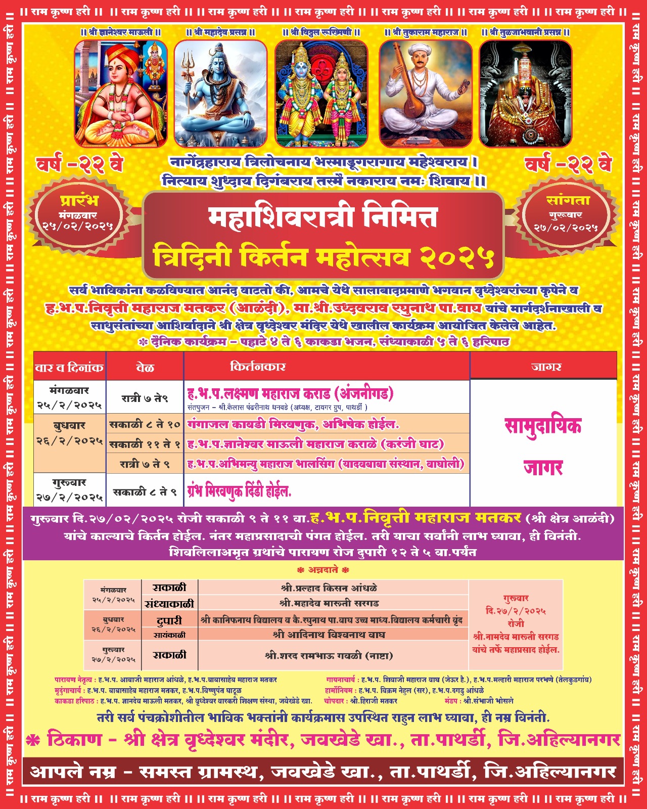 अहमदनगर (सुनिल नजन “चिफब्युरो” अहिल्यानगर जिल्हा प्रतिनिधी) अ.नगर जिल्ह्यातील पाथर्डी तालुक्यातील व्रुद्धेश्वर साखर कारखान्याचे माजी चेरमन उद्धवराव वाघ यांच्या मार्गदर्शनाखाली आणि आळंदी निवासी ह.भ.प.निव्रुत्ती महाराज मतकर यांच्या नियोजनाखाली जवखेडे खालसा येथील महादेव मंदिरात तिनं दिवस किर्तन महोत्सव सोहळ्याचे आयोजन करण्यात आले आहे. दिनांक २५ते२७ फेब्रुवारी या कालावधीत हा सोहळा साजरा होणार आहे.मंगळवारी रात्री ह.भ.प. लक्ष्मण महाराज कराड यांचे किर्तन होईल.बुधवारी सकाळी गंगाजल कावडी मिरवणूक आणि महादेव मंदिरात महाअभिषेक होउन लगेच ज्ञानेश्वर माउली कराळे (करंजी घाट)यांचे किर्तन होईल.रात्री वाघोलीच्या यादव बाबा संस्थानचे पदाधिकारी ह.भ.प.अभिमंन्यु महाराज भालसिंग यांचे किर्तन होईल.गुरुवारी सकाळी ग्रंथ दिंडी मिरवणूकीनंतर ह.भ.प. निव्रुती महाराज मतकर यांच्या काल्याच्या किर्तनाने आणि गावचे जेष्ठ भाविक नामदेव मारुती सरगड यांच्या महाप्रसादाच्या पंगतीने या सोहळ्याची सांगता होणार आहे.तरी पंचक्रोशीतील भाविक भक्तांनी या सोहळ्याला आवर्जून उपस्थित रहावे असे आवाहन जवखेडे खालसा येथील ग्रामपंचायतीचे लोकनियुक्त सरपंच चारुदत्त वाघ मित्र मंडळ आणि ग्रामस्थांच्या वतीने करण्यात आले आहे.