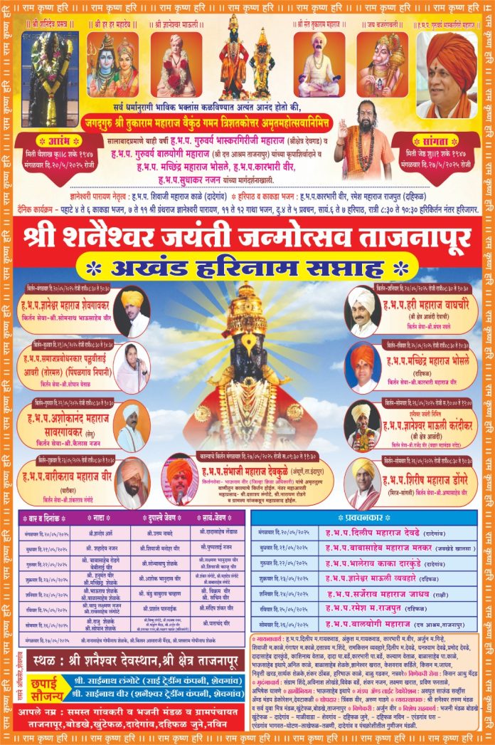 अहमदनगर (सुनिल नजन “चिफब्युरो”स्पेशल क्राईम रिपोर्टर अहिल्यानगर जिल्हा) जगदगुरु श्री संत तुकाराम महाराज वैकुंठगमन त्रीशतकोत्तर अम्रुतमहोत्सवा निमित्त अहिल्यानगर जिल्ह्यातील शेवगाव तालुक्यातील ताजनापूर येथे दिनांक २० ते २७ मे या कालावधीत या अखंड हरिनाम सप्ताहाचे आयोजन करण्यात आले आहे. देवगड संस्थानचे प्रमुख ह.भ.प. भास्करगीरी महाराज, ताजनापूर येथील दत्त देवस्थान आश्रमाचे गुरुवर्य बालयोगी महाराज यांच्या क्रुपा आशिर्वादाने आणि ह.भ.प.मच्छिंद्र महाराज भोसले,ह.भ.प. कारभारी महाराज वीर, ह.भ.प. सुधाकर नजन यांच्या मार्गदर्शनाखाली श्री शनैश्वर जयंती जन्मोत्सवाच्या निमित्ताने ताजनापूर येथे अखंड हरिनाम सप्ताहाचा हा सोहळा संपन्न होत आहे.या सप्ताहात दररोज काकडा भजन,हरीपाठ,ज्ञानेश्वरी पारायण,गाथा भजन, प्रवचन आणि हरी किर्तन या प्रमाणे कार्यक्रमाची रूपरेषा ठरविण्यात आली आहे. सर्व ह.भ.प.दिलिप महाराज देवढे, बाबासाहेब महाराज मतकर, भालेराव काका दारकुंडे, ज्ञानेश्वर माउली व्यवहारे, सर्जेराव महाराज जाधव, रमेश महाराज राजपूत,बालयोगी महाराज यांची प्रवचने होणार आहेत तर सर्व ह.भ.प.ज्ञानेश्वर महाराज शेवगावकर, पल्लवीताई आवरी तोरमल, अशोकानंद महाराज सावरगावकर, बारीक राव महाराज वीर,हरी महाराज वाघचौरे,मच्छिंद्र महाराज भोसले, ज्ञानेश्वर माउली करंदीकर, शिरीष महाराज डोंगरे,यांची किर्तने होणार आहेत.दिनांक २७ मे रोजी ह.भ.प.संभाजी महाराज देवकुळे, यांच्या काल्याच्या किर्तनाने आणि दत्तात्रय लंगोटे,व नारायण रोडगे यांच्या काल्याच्या महाप्रसादाच्या पंगतीने या गौरवशाली अखंड हरिनाम सप्ताहाची सांगता होणार आहे. तरी बोडखे,खुंटेफळ, दादेगाव,जुने नवे दहीफळ, आणि ताजनापूर पंचक्रोशीतील भाविकांनी या पर्वणीचा लाभ घ्यावा असे आवाहन शनैश्वर देवस्थान आणि समस्त गावकरी भजनी मंडळ यांच्या वतीने करण्यात आले आहे.या सप्ताहात ज्ञानेश्वरीचे पारायण अध्ययन ह.भ.प.शिवाजी महाराज काळे हे करणार आहेत.तर हरीपाठ व काकडा भजन ह.भ.प. कारभारी महाराज वीर, व रमेश महाराज रजपूत हे करणार आहेत.तरी या सप्ताहात सर्व भाविकांनी दररोज उपस्थित रहावे असे सप्ताह कमीटीतर्फे तर्फे कळविण्यात आले आहे.