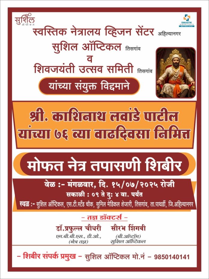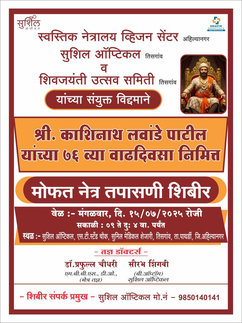 अहमदनगर (सुनिल नजन “चिफब्युरो” स्पेशल क्राईम रिपोर्टर अहिल्यानगर जिल्हा) पाथर्डी पंचायत समितीचे माजी सभापती जेष्ठ नेते काशिनाथ पाटील लवांडे यांच्या 75 व्या वाढदिवसा निमित्त तिसगाव येथे मोफत नेत्ररोग तपासणी शिबिराचे आयोजन करण्यात आले आहे.स्वस्तिक नेत्रालय व्हिजन सेंटर,सुशिल ऑप्टिकल तिसगाव शिवजयंती उत्सव समिती यांच्या संयुक्त विद्यमाने या शिबिराचे आयोजन करण्यात आले आहे. मंगळवार दिनांक १५ जुलै रोजी सकाळी ९ ते सायंकाळी ४ वाजेपर्यंत तिसगाव एसटी स्टँडजवळील सुनिल मेडिकल शेजारी या शिबिराचे ठिकाण आहे.तरी तिसगाव पंचक्रोशीतील रुग्णांनी प्रथम नावनोंदणी करून या संधीचा लाभ घ्यावा असे आवाहन शिवजयंती उत्सव समितीच्या वतीने करण्यात आले आहे. तसेच सकाळी अकरा वाजता तिसगाव येथील पाथर्डी रोडवरील आशिर्वाद मंगल कार्यालयात जेष्ठ नेते काशिनाथ पाटील लवांडे यांच्या ७५ वी च्या निमित्ताने अभिष्टचिंतन सोहळ्याचे आयोजन करण्यात आले आहे. तरी या सोहळ्यास पंचक्रोशीतील सर्व कार्यकर्त्यांनी आवर्जून उपस्थित रहावे असे आवाहन सुनिल शिंगवी,आणि सुशिल ऑप्टिकल सेंटर,व शिवजयंती उत्सव समितीच्या वतीने करण्यात आले आहे.