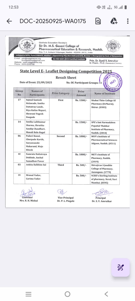 नाशिक : जागतिक फार्मासिस्ट दिनानिमित्त दिनांक २५ सप्टेंबर २०२५ रोजी सर डॉ. एम.एस. गोसावी कॉलेज ऑफ फार्मास्युटिकल एज्युकेशन अँड रिसर्च, नाशिक येथे आयोजित राज्यस्तरीय ई-लेफलेट डिझायनिंग स्पर्धेत श्री पंचवटी एज्युकेशन सोसायटीच्या “एस.एन.पी.टी. इन्स्टिट्यूट ऑफ फार्मसी “या संस्थेच्या द्वितीय वर्ष डिप्लोमा फार्मसीच्या विद्यार्थिनींनी उल्लेखनीय यश संपादन केले. या स्पर्धेमध्ये सोनिका शर्मा, श्रुतीका चौधरी आणि मोनाली बागुल यांनी सहभाग घेऊन उत्कृष्ट सादरीकरण करत प्रथम क्रमांक पटकावला. त्यांना रु.१५००/- चे रोख पारितोषिक देऊन गौरवण्यात आले. या यशाबद्दल संस्थेचे प्राचार्य डॉ. विशाल एस. गुलेचा आणि सर्व शिक्षकवृंदया तसेच संस्थेचे अध्यक्ष मा. नरेंद्रभाई ठाक्कर, उपाध्यक्ष मा. प्रकाशभाई पटेल, कार्यालयीन सचिव मा. देवेंद्रभाई पटेल, एस.एन.पी.टी. सचिव मा. उपेंद्रभाई दिनानी व संयुक्त सचिव मा. अभयभाई चौकशी यांनी विद्यार्थिनींचे कौतुक करत पुढील वाटचालीसाठी शुभेच्छा दिल्या.